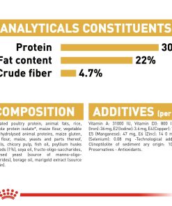 家禽*ミート、動物性脂肪、米、植物性分離タンパク**、とうもろこし、植物性繊維、とうもろこし粉、加水分解動物性タンパク、コーングルテン、チコリパルプ、魚油、サイリウム、大豆油、フラクトオリゴ糖、加水分解酵母(マンナンオリゴ糖源)、ルリチシャ油、マリーゴールド抽出物(ルテイン源)、アミノ酸類(L-リジン、DL-メチオニン、タウリン、L-カルニチン)、ゼオライト、ミネラル類(K、Ca、Cl、Zn、Mn、Fe、Cu、I、Se)、ビタミン類(A、コリン、D3、イノシトール、E、ナイアシン、C、パントテン酸カルシウム、B6、B2、B1、葉酸、ビオチン、B12)、酸化防止剤(BHA、没食子酸プロピル) *鶏、七面鳥 **超高消化性タンパク(消化率90%以上) 主原料はすべて天然由来原料を使用しており、着色料を使用していない為、粒の色調等にばらつきがある場合がございますが、品質に問題はありませんので、安心してご利用ください。