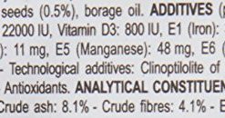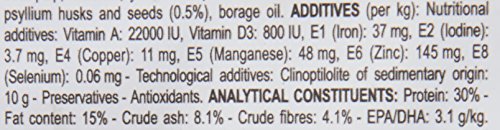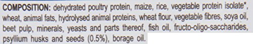 家禽*ミート、とうもろこし、植物性分離タンパク**、小麦、米、加水分解動物性タンパク、動物性脂肪、植物性繊維、大豆油、ビートパルプ、魚油、酵母、フラクトオリゴ糖、サイリウム、ルリチシャ油、アミノ酸類(DL-メチオニン、L-リジン、タウリン、L-シスチン、L-カルニチン)、ゼオライト、ミネラル類(K、Ca、P、Cl、Zn、Mn、Fe、Cu、I、Se)、ビタミン類(A、コリン、D3、E、C、ナイアシン、パントテン酸カルシウム、B2、B6、B1、葉酸、ビオチン、B12)、酸化防止剤(BHA、没食子酸プロピル) *鶏、七面鳥 **超高消化性タンパク(消化率90%以上) 主原料はすべて天然由来原料を使用しており、着色料を使用していない為、粒の色調等にばらつきがある場合がございますが、品質に問題はありませんので、安心してご利用ください。