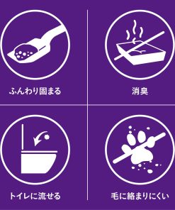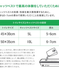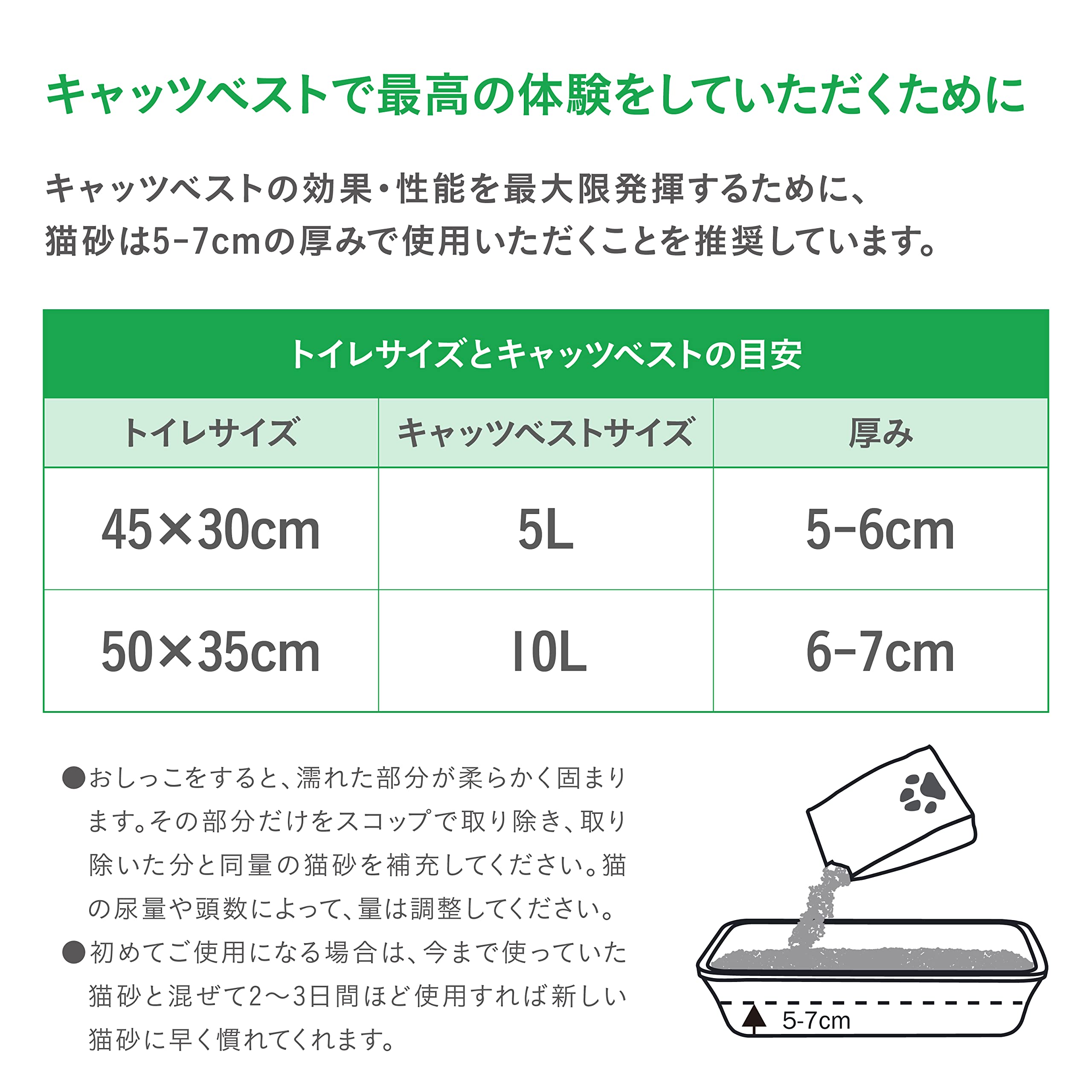 ペットの体型にあった容器に5~7cm位の厚さで平らに敷き詰めます。おしっこをすると、濡れた部分が柔らかく固まります。その部分だけをスコップで取り除き、同量の猫砂を補充してください。