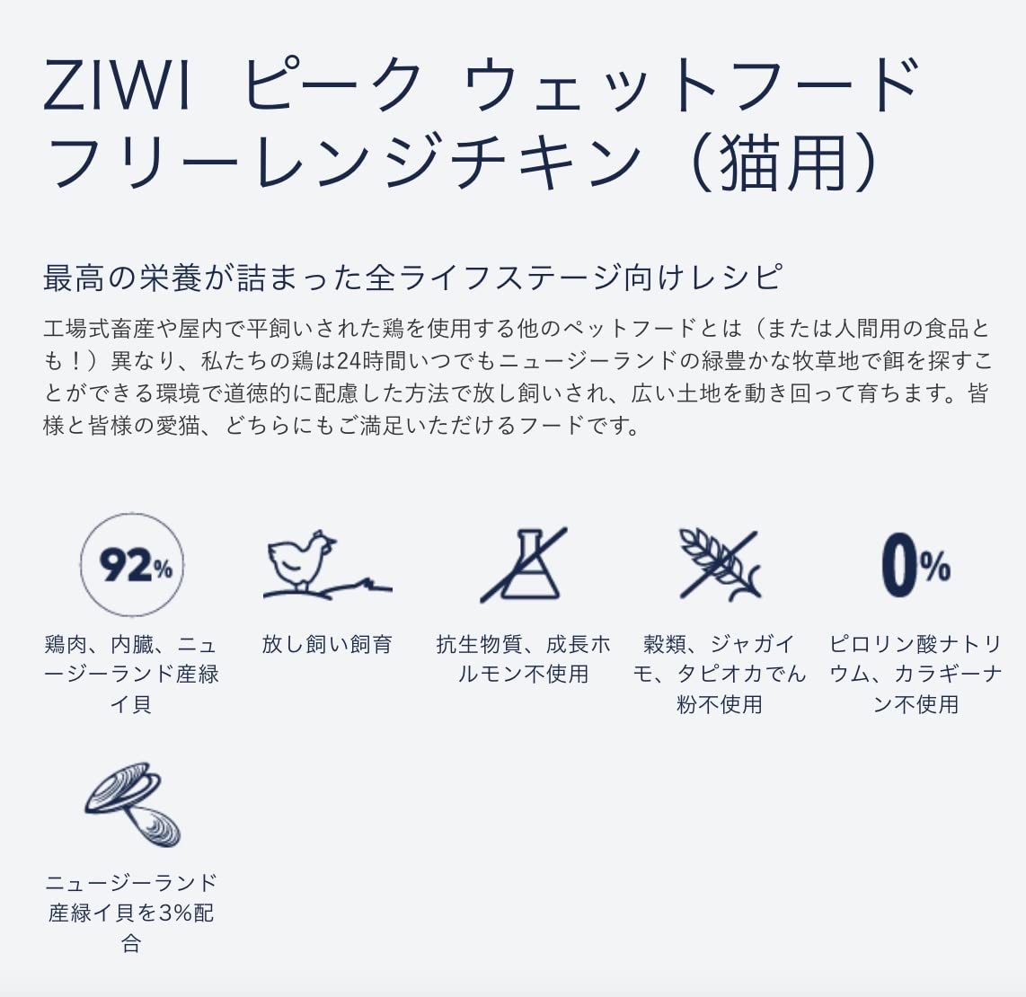 - 肉が豊富な食事を必要とする猫の生物学的なニーズに応え、鶏肉、内臓、骨、ニュージーランド産緑イ貝を92%配合した水分たっぷりのフード